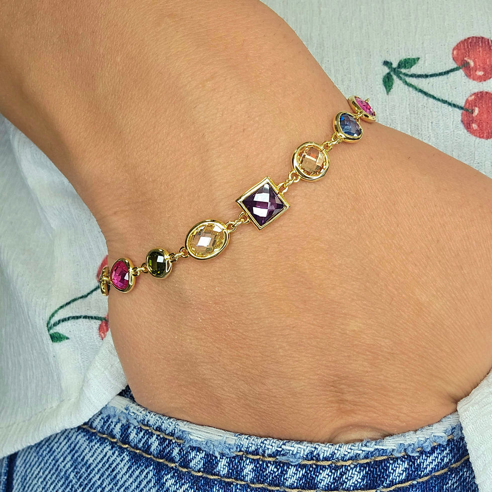 Bracciale dorato in argento 925% con zirconi colorati di varie forme, chiusura a tennis, misura 19cm.
